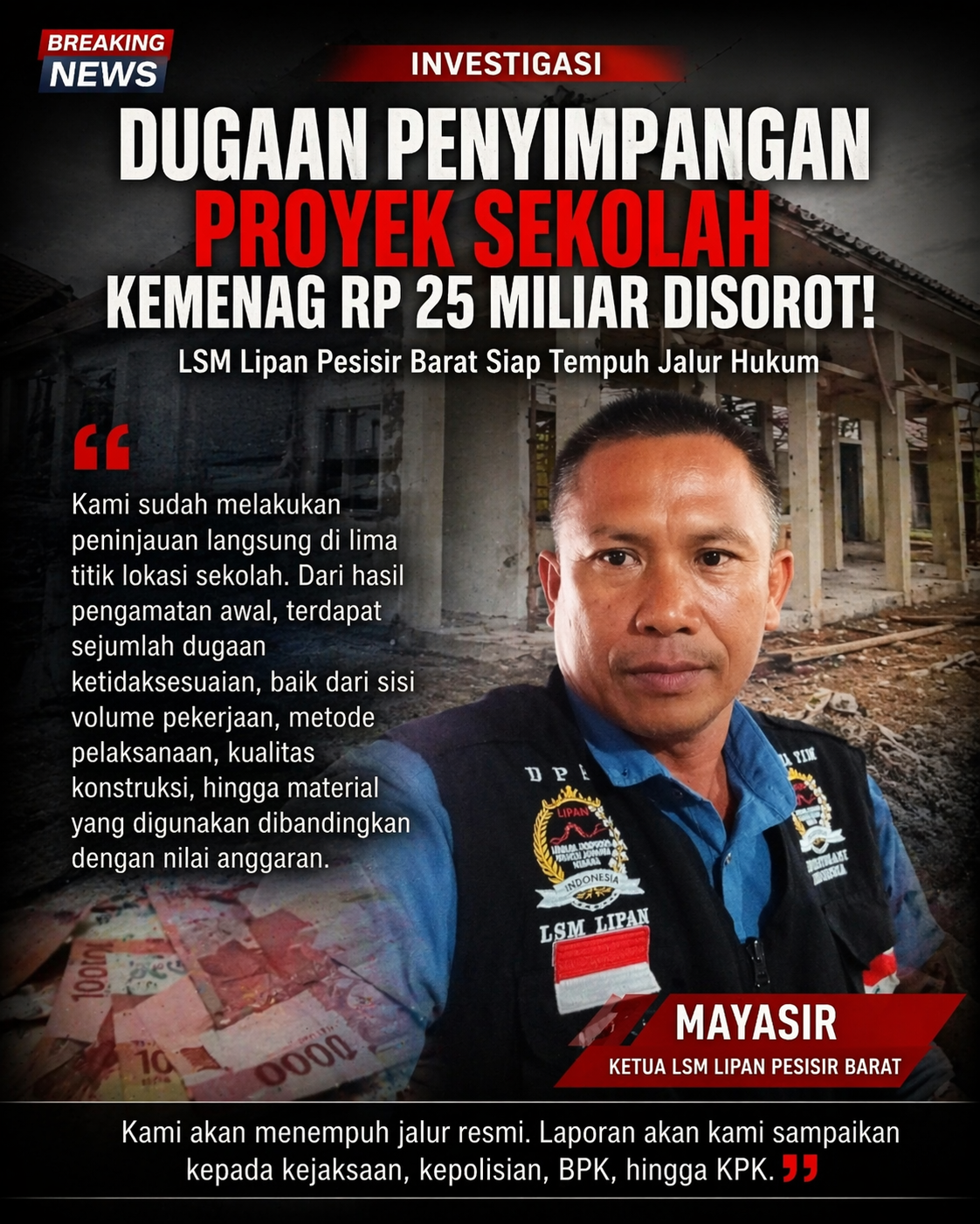 PESISIR BARAT – Sorotan tajam datang dari Lembaga Independen Pemantau Anggaran Negara (LSM Lipan) Kabupaten Pesisir Barat terkait pelaksanaan proyek pembangunan fisik sejumlah sekolah di bawah naungan Kementerian Agama, meliputi tingkat MI, MTs, hingga MA.