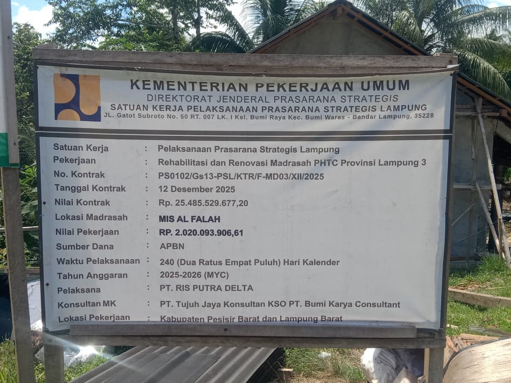 Berdasarkan papan informasi proyek di lokasi, kegiatan rehabilitasi dan renovasi Madrasah MIS Al Falah merupakan bagian dari program Kementerian Pekerjaan Umum melalui Direktorat Jenderal Prasarana Strategis dengan nilai pekerjaan mencapai Rp2,02 miliar yang bersumber dari APBN. Proyek ini memiliki durasi pelaksanaan selama 240 hari kalender sejak kontrak ditandatangani pada 12 Desember 2025 dan dikerjakan oleh kontraktor PT Ris Putra Delta dengan pengawasan konsultan manajemen konstruksi.