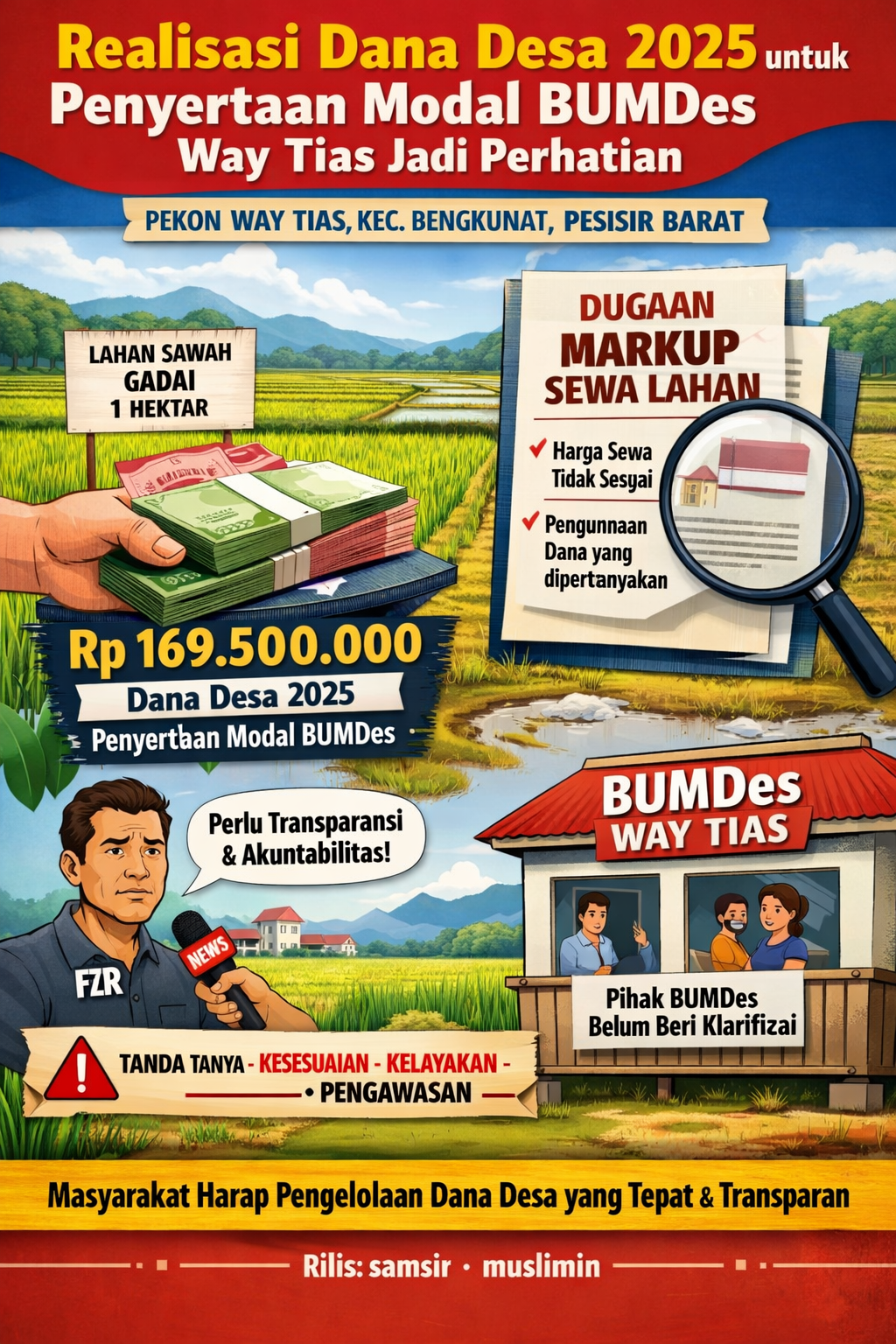 WAY TIAS — Realisasi Dana Desa Pekon Way Tias kecamatan bengkunat kabupaten pesisir barat tahun anggaran 2025 tercatat mengalokasikan anggaran sebesar Rp169.500.000 untuk kegiatan penyertaan modal desa kepada Badan Usaha Milik Desa (BUMDes). Namun, penggunaan dana tersebut kini menjadi perhatian setelah muncul catatan terkait pemanfaatannya di lapangan.